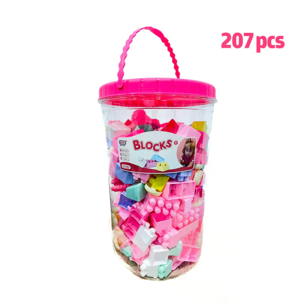 مجموعة مكعبات بناء تعليمية كبيرة في دلو باللون الوردي، 207 قطعة.