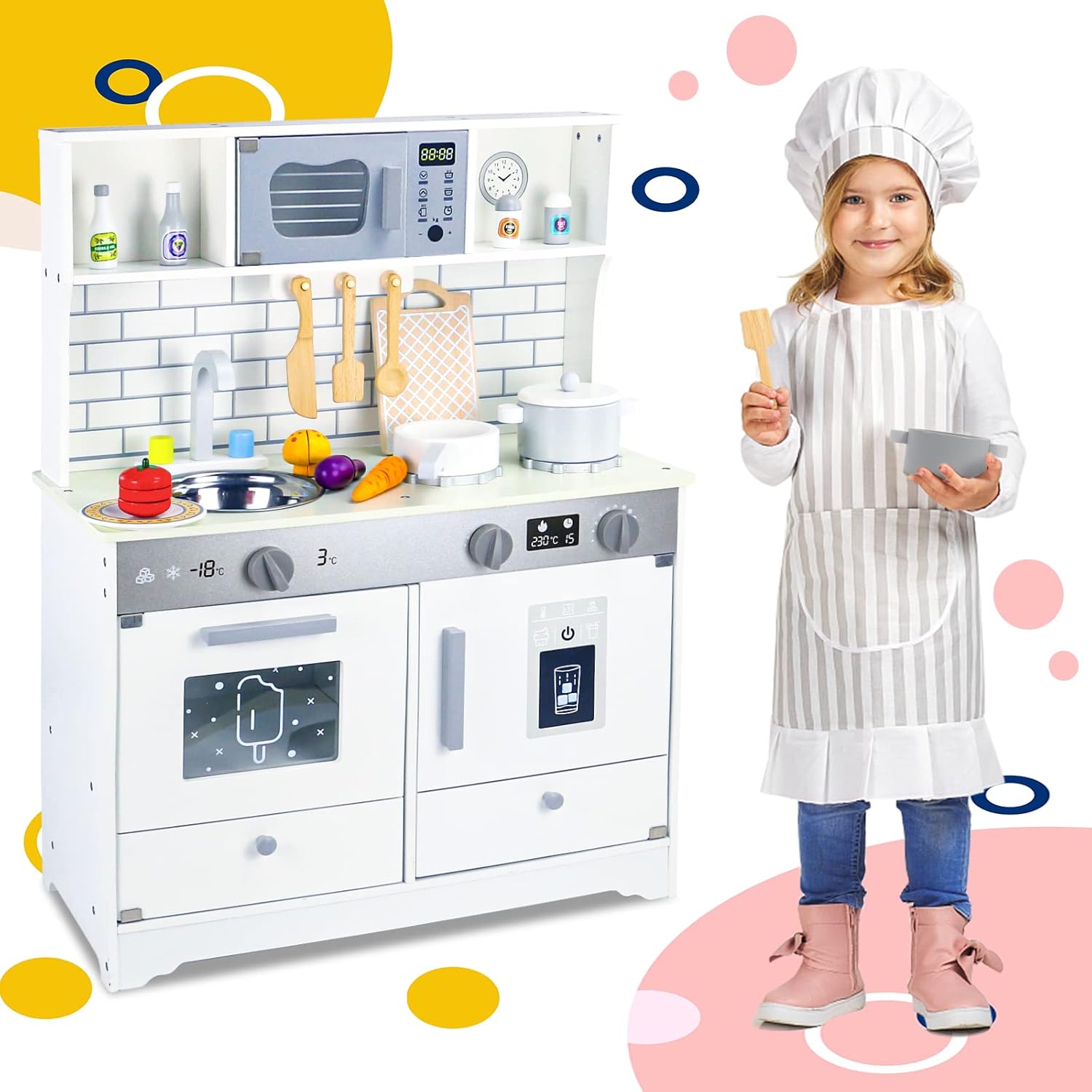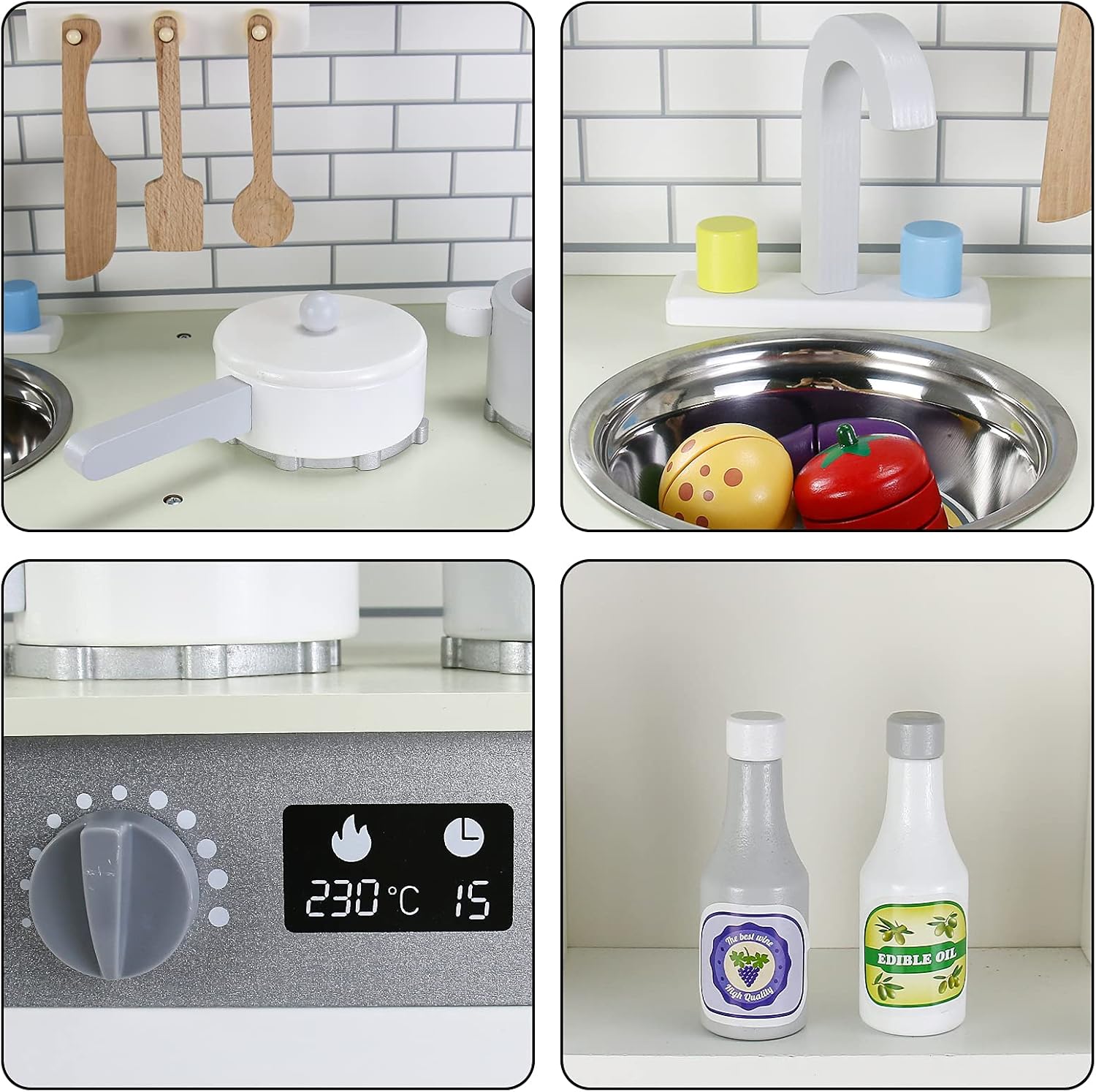 مصنوعة من خشب عالي الجودة، وتتميز بتصميم أنيق وألوان جذابة تناسب جميع الديكورات. تحتوي المجموعة على فرن، موقد، حوض، أرفف تخزين، وأدوات مطبخ صغيرة لتجربة لعب متكاملة.