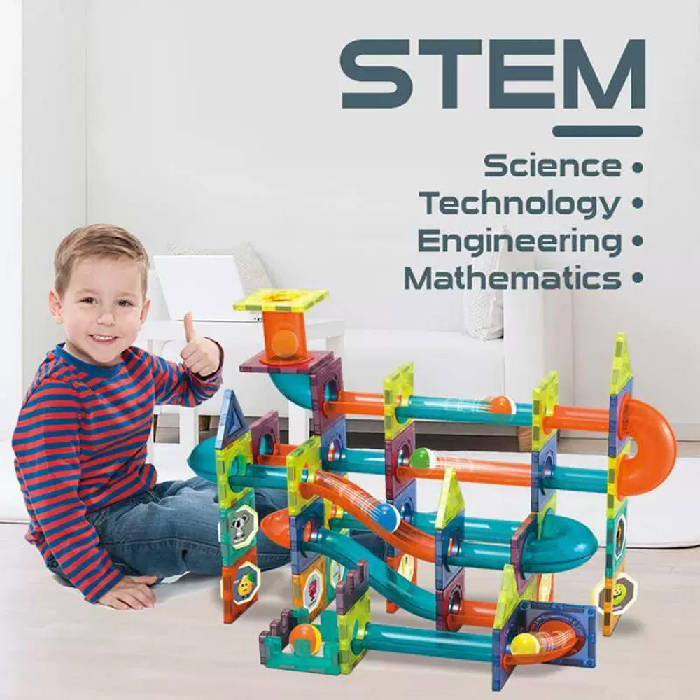 تصميم ممتع: صُممت البلاطات المغناطيسية على شكل نوافذ يمكن تدويرها. الأنابيب شفافة ويمكن أيضًا تركها مفتوحة ليتمكن الأطفال من رؤية الكرات الرخامية أثناء تحركها من أعلى المجموعة إلى أسفلها.