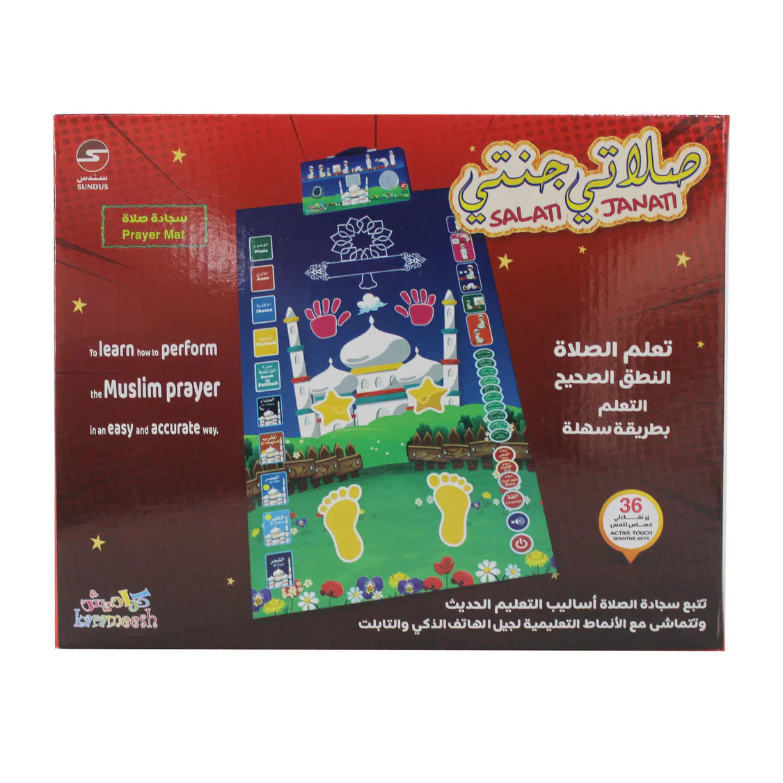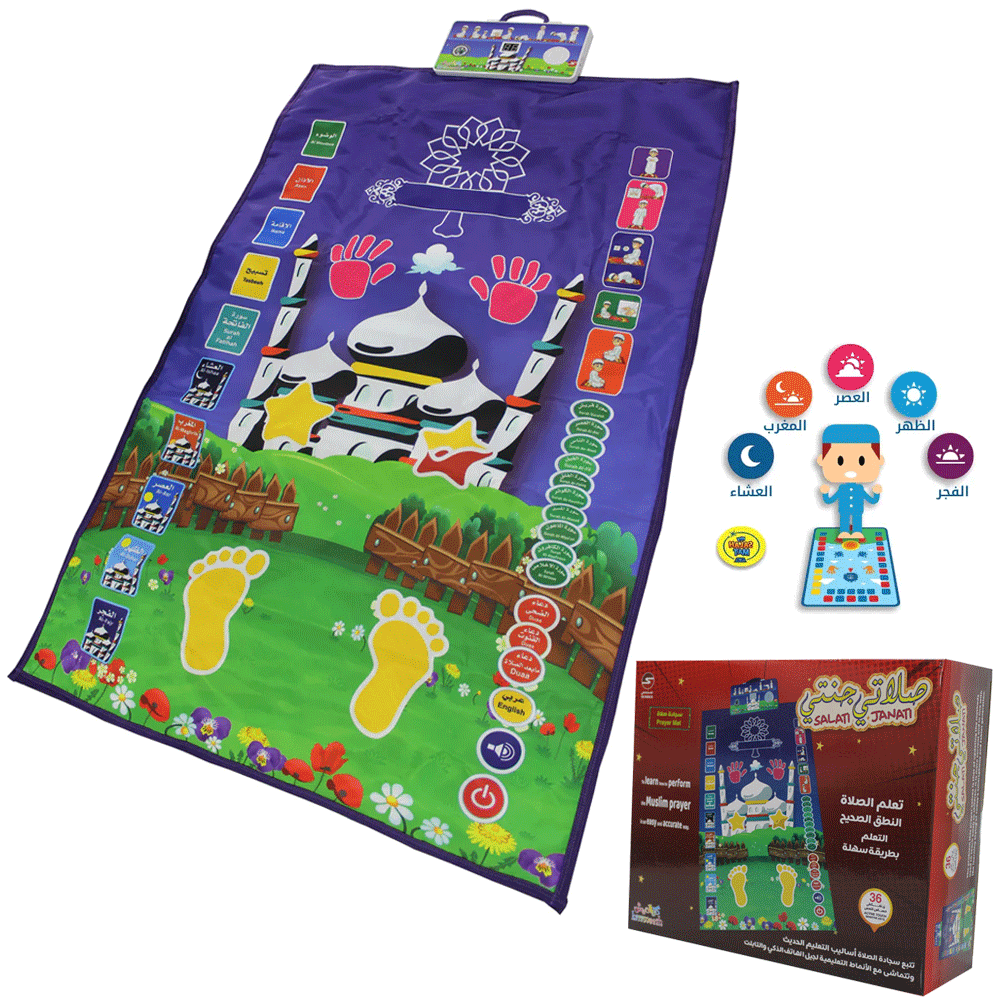صُممت سجادة الصلاة لتعليم الأطفال كيفية أداء الصلاة بطريقة مبتكرة وممتعة باستخدام 36 زر تحكم باللمس. تساعد هذه السجادة التفاعلية الأطفال على تعلم الصلاة وأدائها بطريقة ممتعة وسهلة.