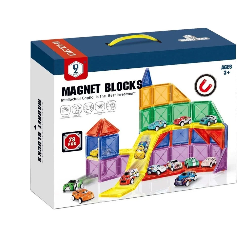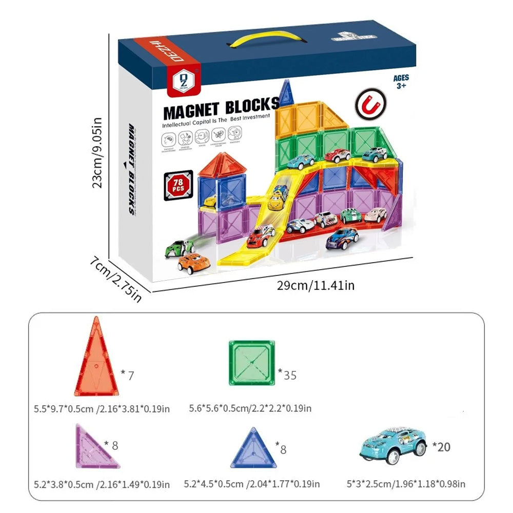 يتكون المكعب المغناطيسي من 78/68 قطعة، ويضم 20 سيارة، حيث يمكنك بناء هياكل متنوعة، واللعب بالسيارات، حيث تتوفر أشكال وألوان مختلفة. إنه مفيد جدًا لتنمية مهارات الطفل الحركية والبصرية، ويعزز نموه العقلي وإدراكه الصحيح للألوان والأشكال.