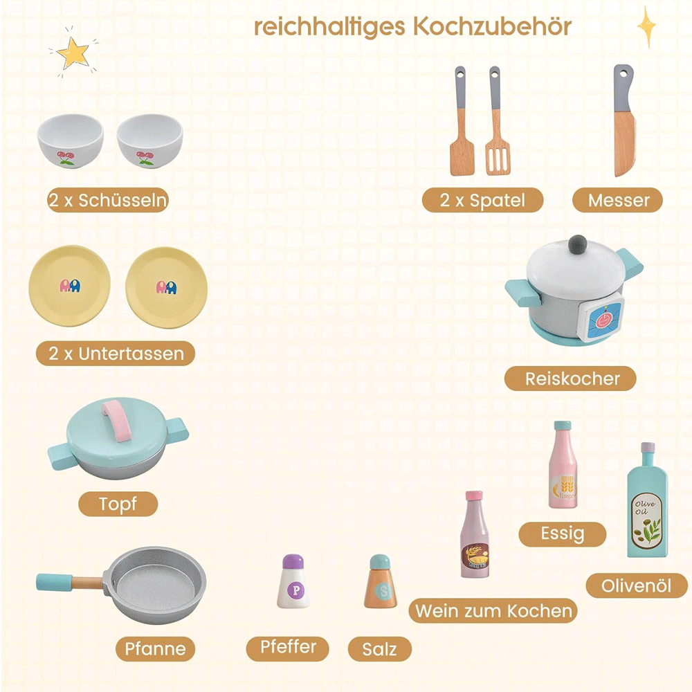 - بناء آمن ومستقر: مطبخنا الخشبي متين وآمن بما يكفي للأطفال الصغار للعب به. زوايا مستديرة تحمي الأطفال من الخدوش. بالإضافة إلى ذلك، تضمن الأرجل الخشبية الصلبة الاستقرار والاستقرار بشكل عام أثناء الاستخدام.