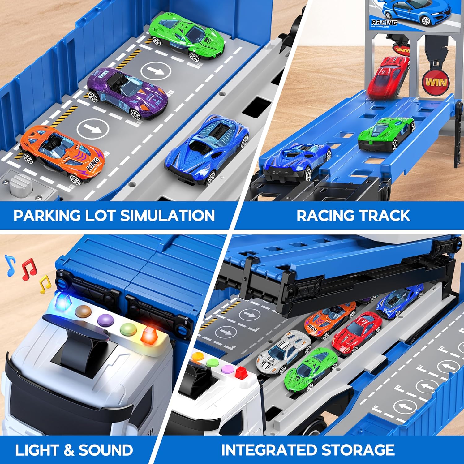- ألعاب شاحنة النقل 3 في 1: تتميز شاحنة النقل هذه بتصميم قابل للطي، وتتميز بسيارة حاوية بمسار المنجنيق وحجرة تخزين لـ 8 قطع من سيارات السباق الملونة المصبوبة، تأتي مع أضواء وامضة وتصدر أصوات بوق مرور مختلفة، مما يوفر تجربة نقل كاملة لعشاق السيارات الصغار. تتضمن أيضًا لافتات المرور وعلامات السباق لأي تحدي سباق.