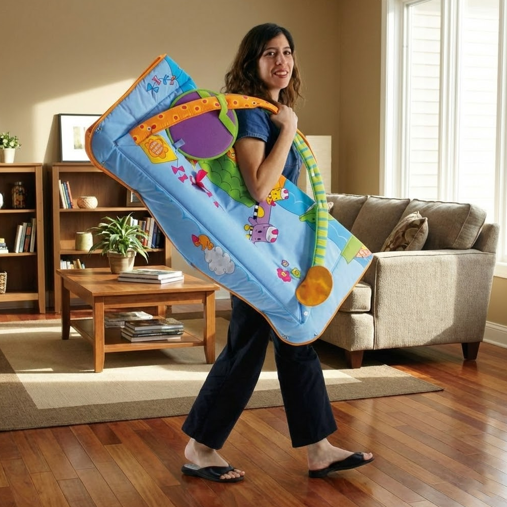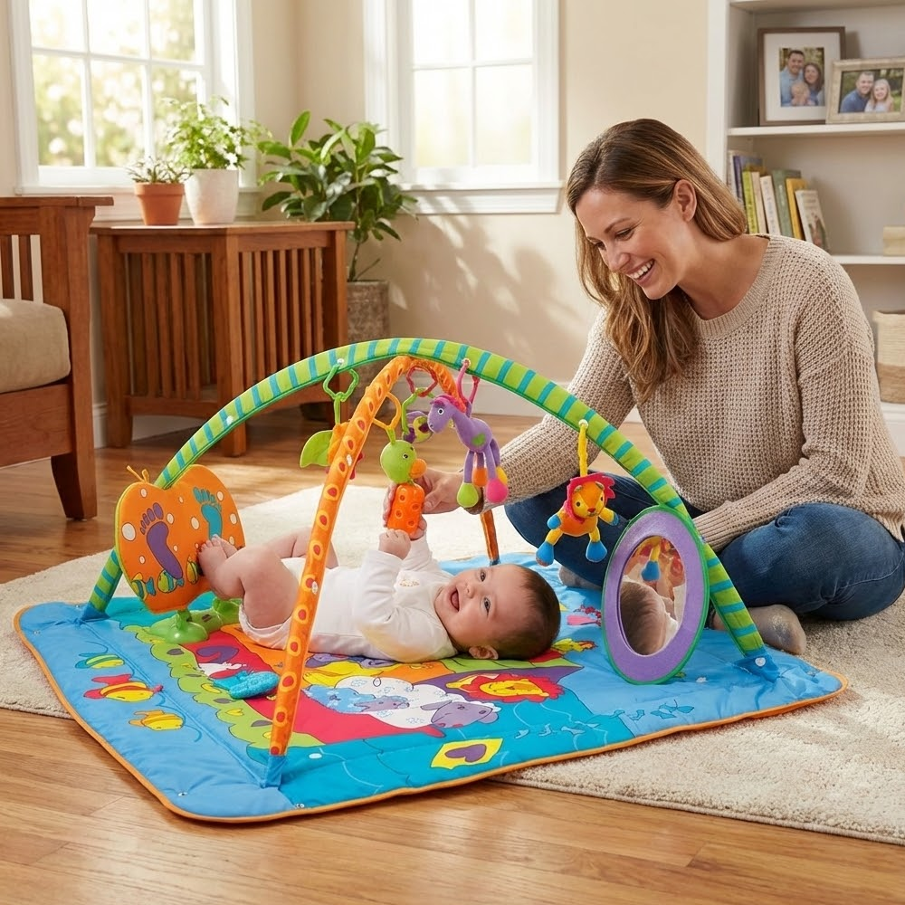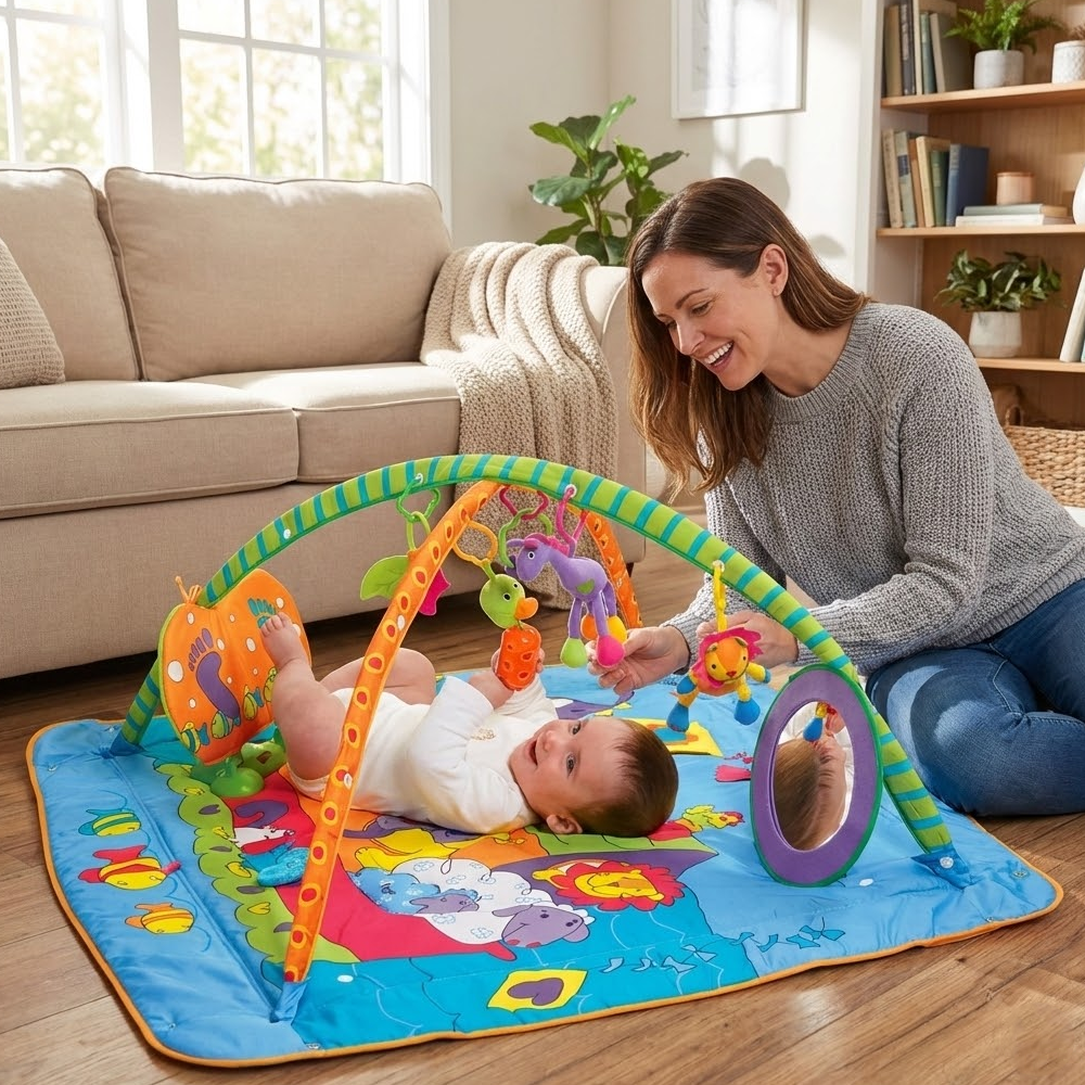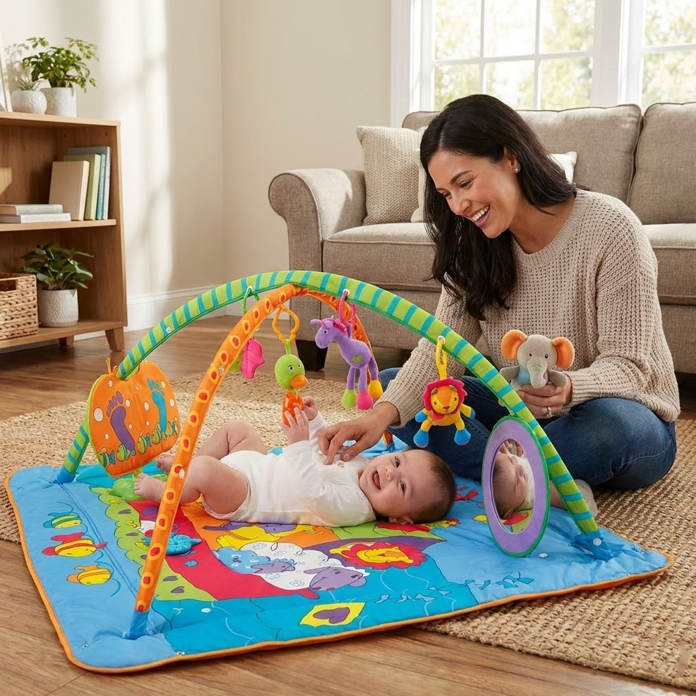 مصممة بألوان زاهية ورسومات محببة تجذب انتباه الطفل، مع أقواس تضم ألعابًا معلّقة، ومرايا آمنة، ولوحة لركل القدمين لتحفيز الحركة والنشاط.