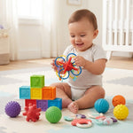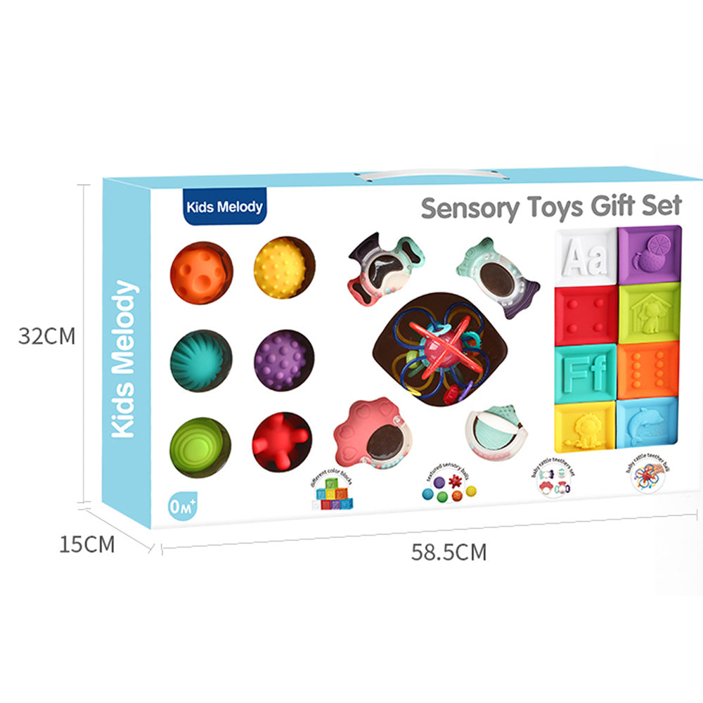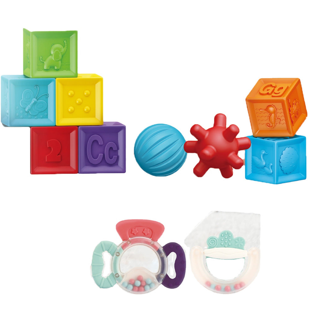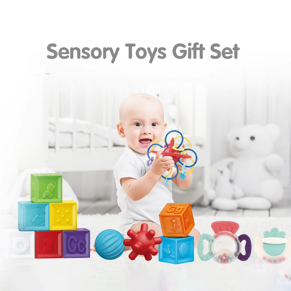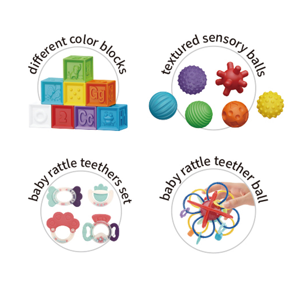 امنح طفلك بداية مثالية مع مجموعة هدايا ألعاب الأطفال الحسية المتكاملة هذه، المصممة بعناية لدعم التطور الحسي والمهارات الحركية والتعلم المبكر منذ الولادة. تتضمن هذه المجموعة مكعبات ضغط ناعمة، وكرات حسية ذات ملمس مميز، وعضاضات خشخشة متعددة، وكرة خشخشة عضاضة، مما يوفر مجموعة متنوعة من الأشكال والقوام والألوان الزاهية التي تحفز فضول طفلك.