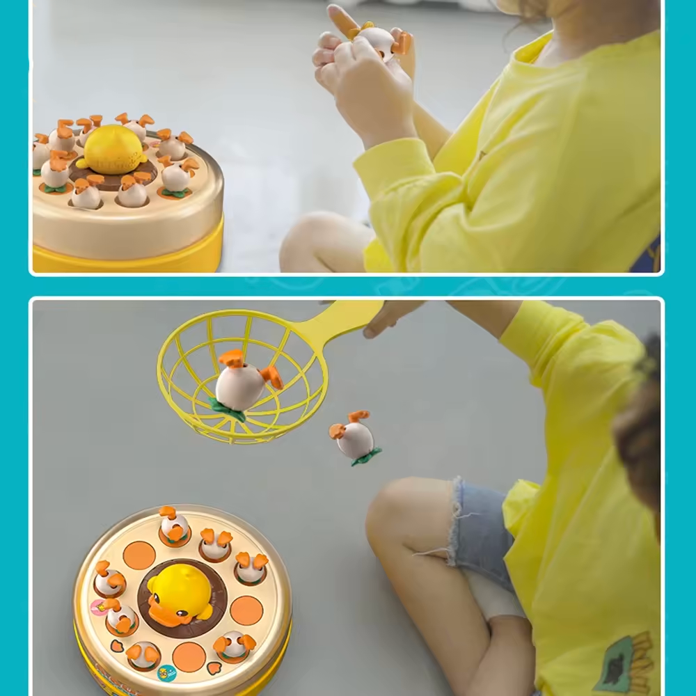 【سهلة اللعب والاستمتاع】يمكن لطفلين اللعب معًا، والاستمتاع بساعات من المرح. ما عليك سوى تركيب البطاريات، ووضع ألعاب البطة والبيض على اللوحة، وتشغيل المفتاح. ستدور ألعاب البيض مع الموسيقى وترتد عشوائيًا، مما يشجع الأطفال على اصطيادها باستخدام الشبكة ومعرفة من يفوز.