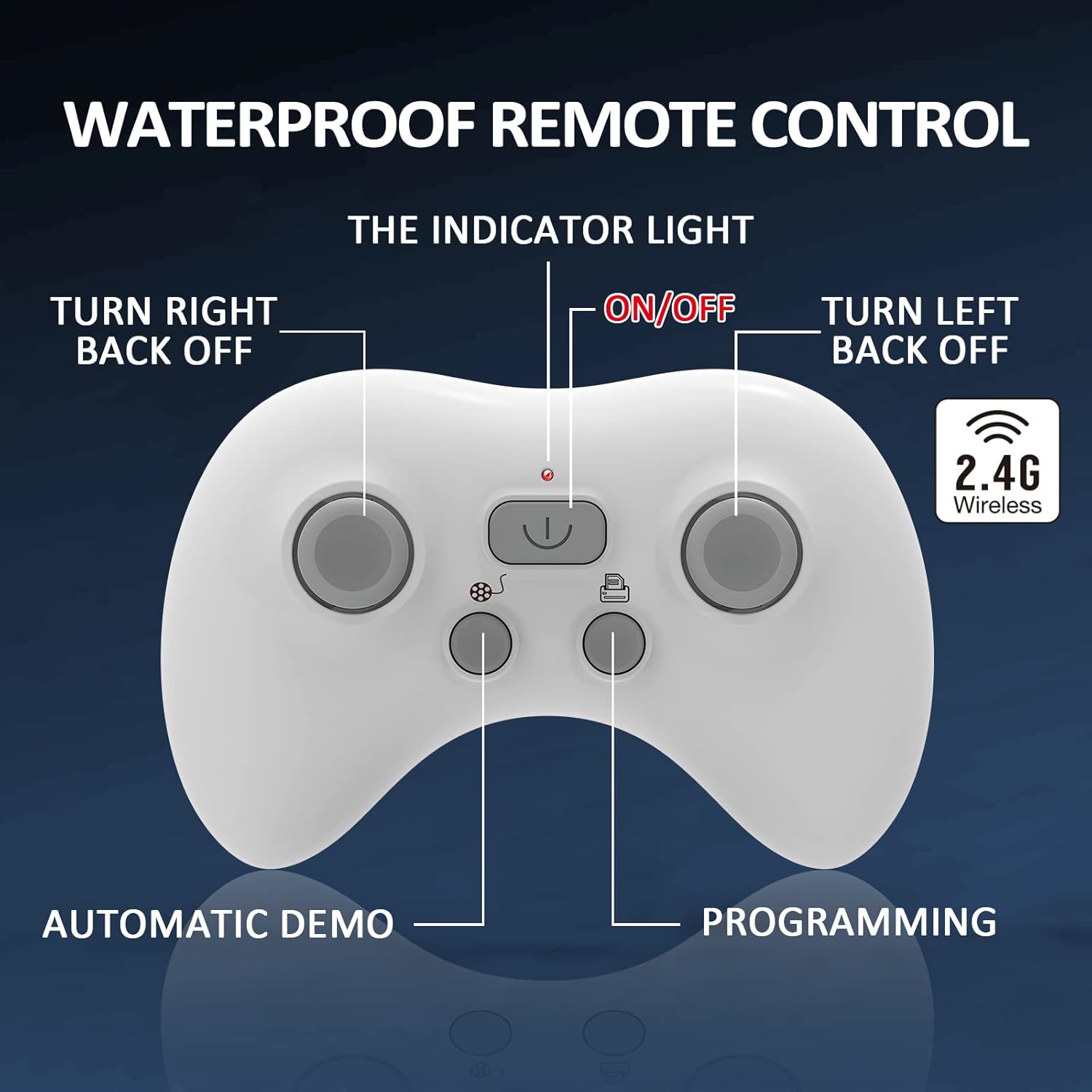 - 【جهاز تحكم عن بعد مقاوم للماء 2.4 جيجاهرتز و4 قنوات】توفر تقنية التحكم عن بعد غير المحدودة 2.4 جيجاهرتز التحكم للأمام والخلف واليسار واليمين والبرمجة والتحكم في الوضع التلقائي. يمكن للأسماك التي يتم التحكم فيها عن بعد السباحة على مسافة لاسلكية 30-40 مترًا. تصميم زر بسيط وسهل التحكم. يتطلب جهاز التحكم بطاريتين AA (غير متضمنة).