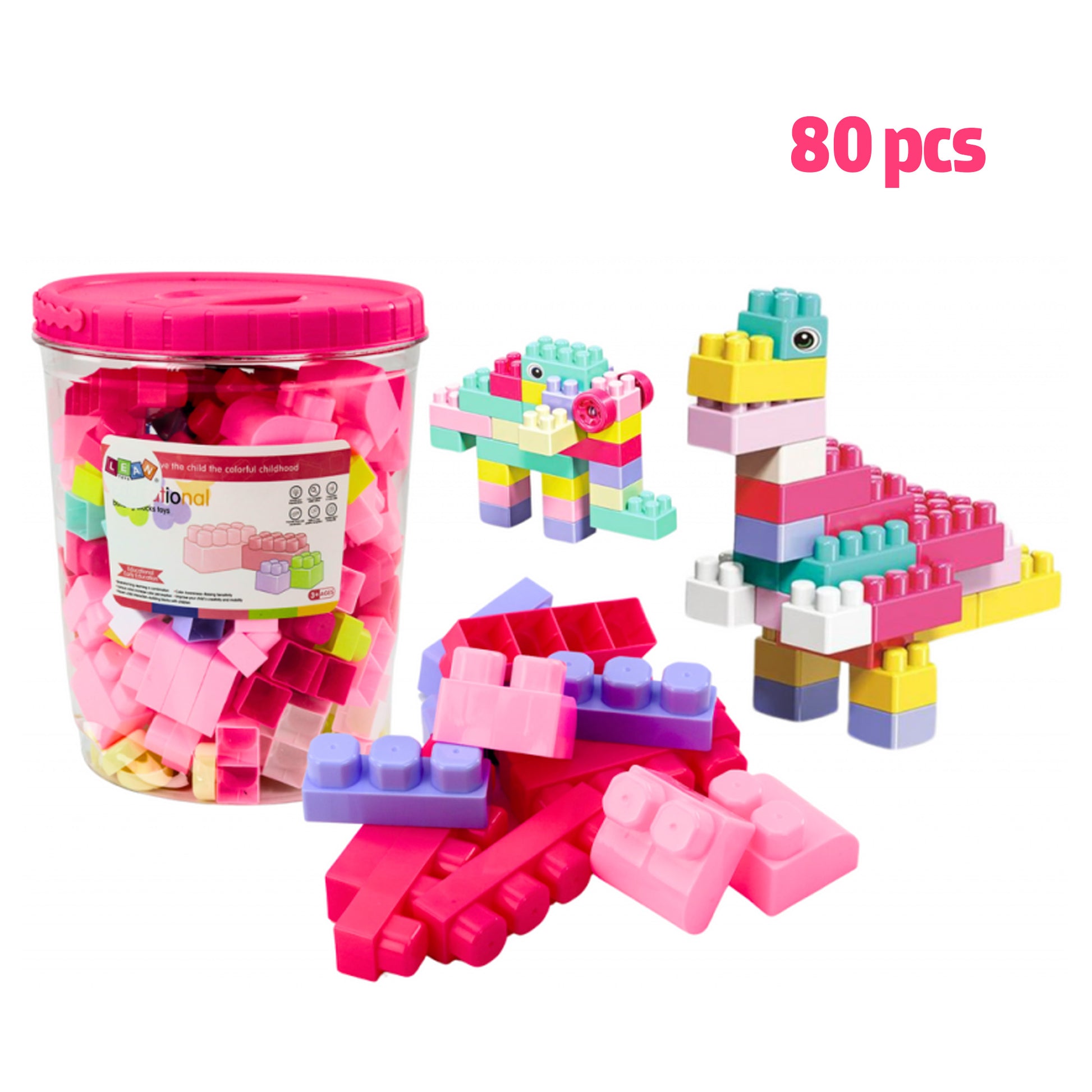 مجموعة مكعبات بناء تعليمية كبيرة في دلو باللون الوردي، 80 قطعة.
