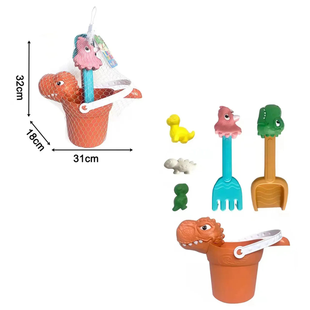 مجموعة ألعاب الرمل الملونة تتكون من 6 قطع مصممة على شكل ديناصورات مثالية للأطفال للعب داخل وخارج المنزل. مثل جميع ألعاب الشاطئ تعد سهلة الاستخدام لحمل الرمل وتشكيله باستخدام الملحقات المختلفة.
