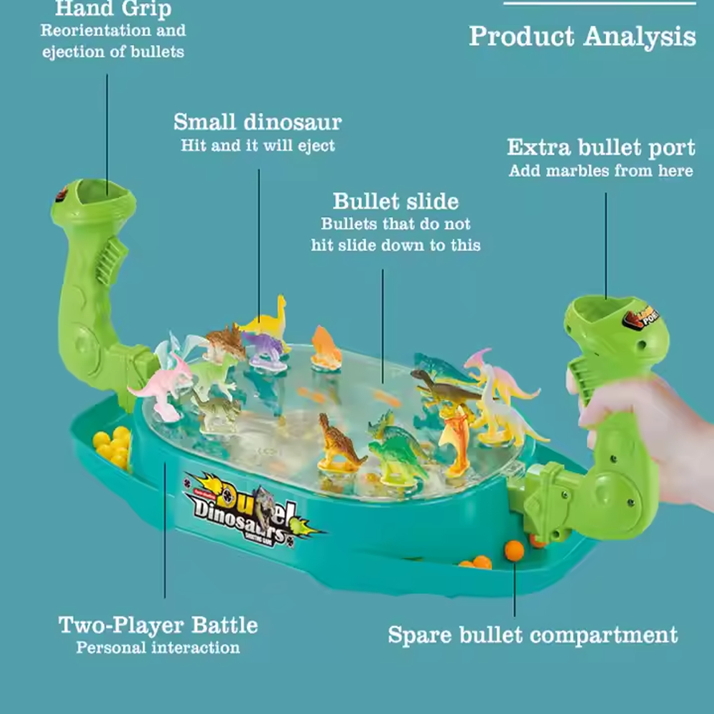 أشعل حماس أطفالك مع لعبة معركة الديناصورات التفاعلية! لعبة لوحية مبتكرة تجمع بين المرح والتعليم، حيث يتواجه الديناصوران في معركة شيقة باستخدام حبات القذف الملونة. تساعد هذه اللعبة على تطوير مهارات التنسيق بين العين واليد، والتركيز، وردود الفعل السريعة بطريقة ممتعة وآمنة.