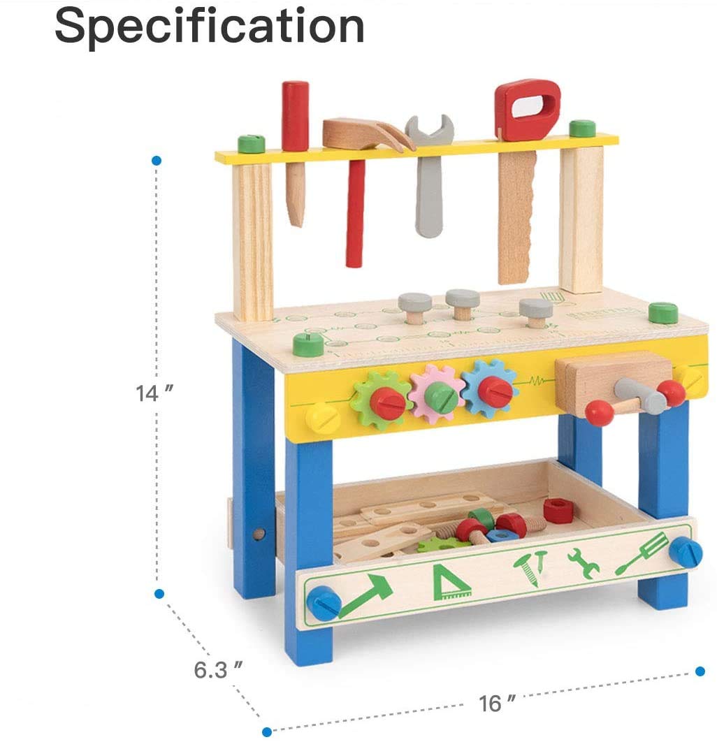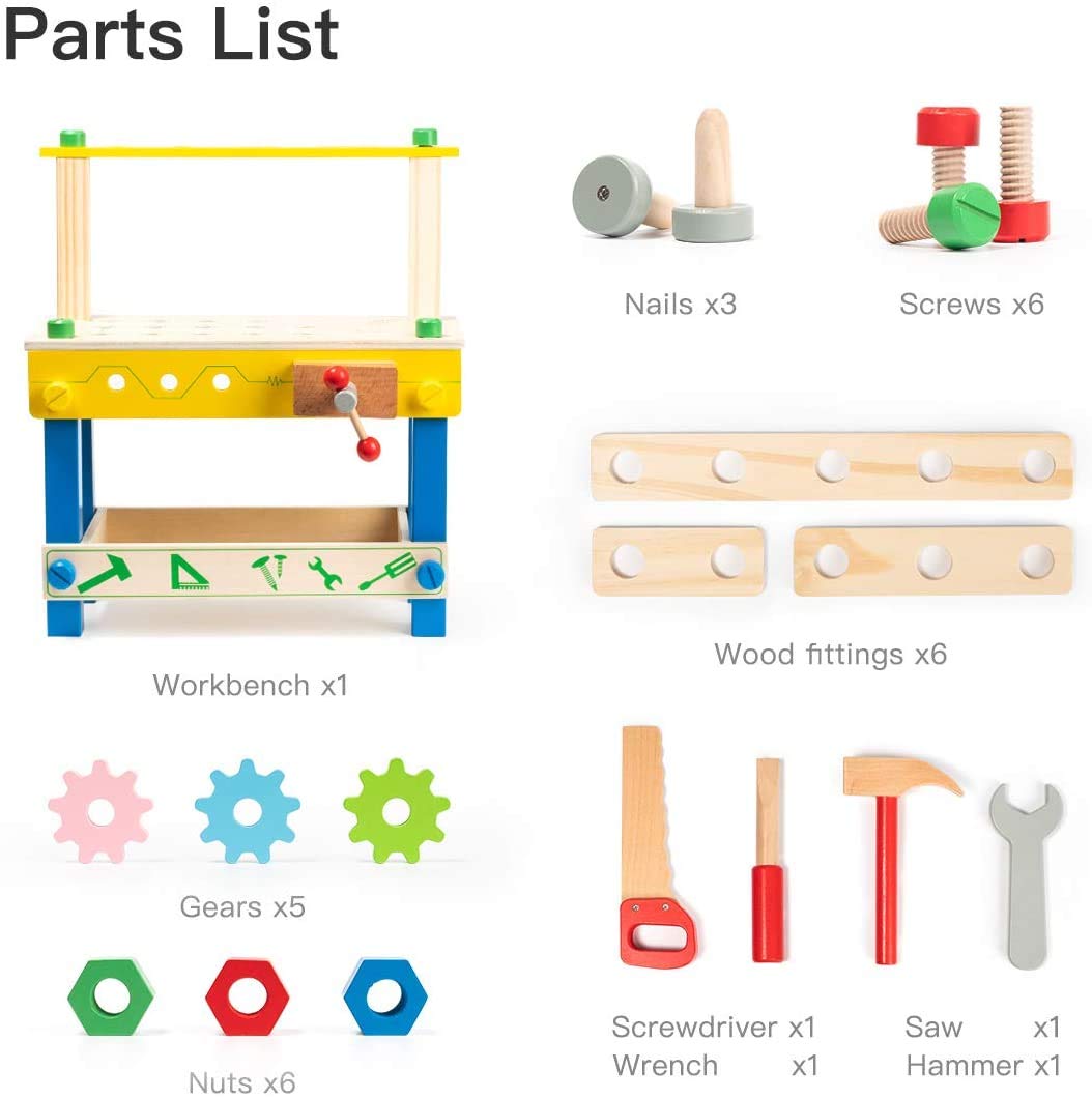 • [غني بالألوان] - تتميز طاولة العمل الخشبية هذه بجميع أجزائها بشكل زاهية، مما يجعلها أكثر للأطفال. تم تصميم أدوات خشبية متعددة مخصصة للأطفال حصريًا لإبداعهم. تتضمن مفتاح ربط خشبي، ومنشار، ومطرقة، ومفكي، ومسمار.