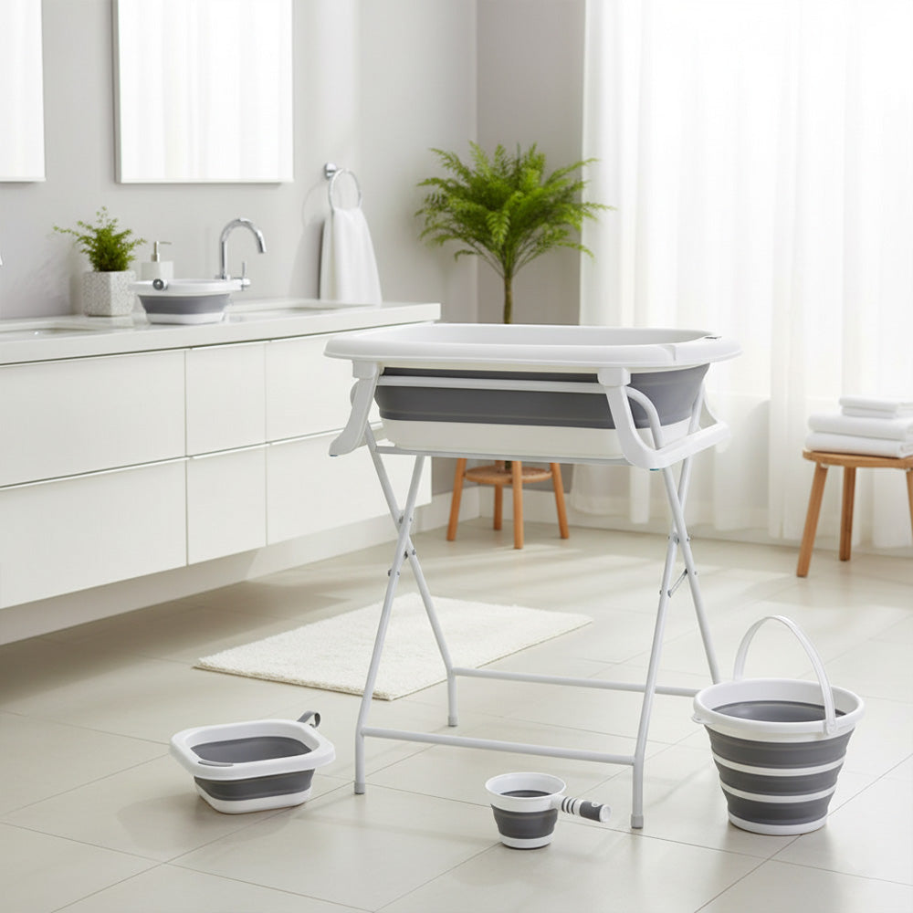 يتضمن حوض استحمام، وحامل، وكرسي استحمام مائل، ومغرفة ماء، وحوض غسيل، ودلو
